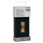 De Sigel SuperDym glasmagneten hebben een kubusvorm. De hechtkracht is super strong en houdt ongeveer 8 vel papier vast. De afmeting bedraagt 11 x 11 x 11 mm. In deze verpakking zitten 3 magneten in metallic kleuren. De kleuren zijn titaangrijs, koper en goud.